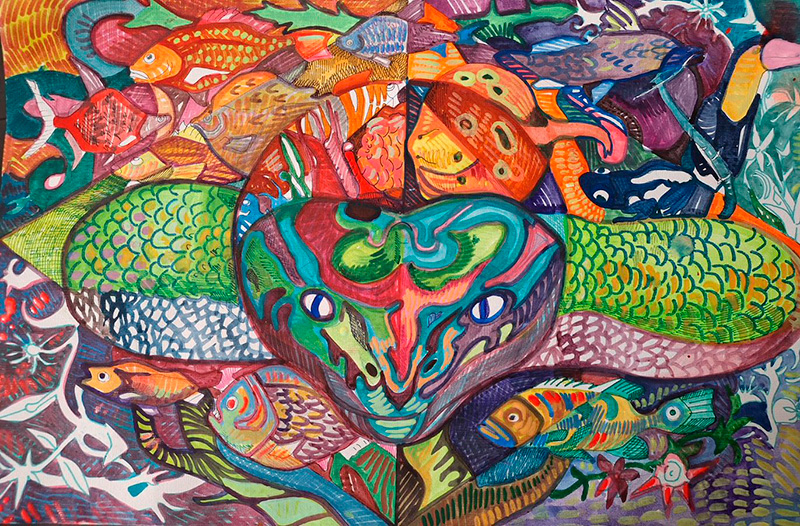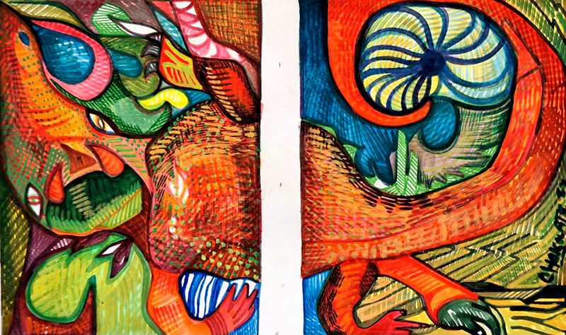 ORGANISMOS Autor: CHOKOLATETítulo: OrganismosTécnica: Acrílico y plumonesDimensiones: 49cm x 32mAño: 2024