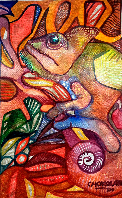 CAMALEÓN Autor: CHOKOLATETítulo: CamaleónTécnica: Acrílico y acuarelaDimensiones: 18cm x 28mAño: 2024