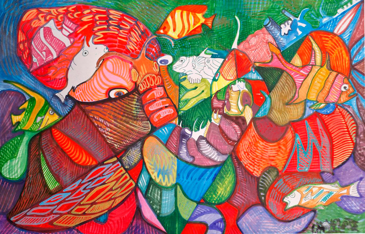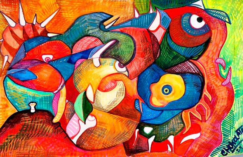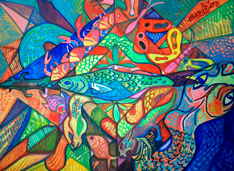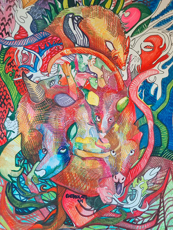 TLACUACHE Autor: CHOKOLATETítulo: TlacuacheTécnica: Acrílico, acuarela y estilógrafoDimensiones: 35cm x 47cmAño: 2024